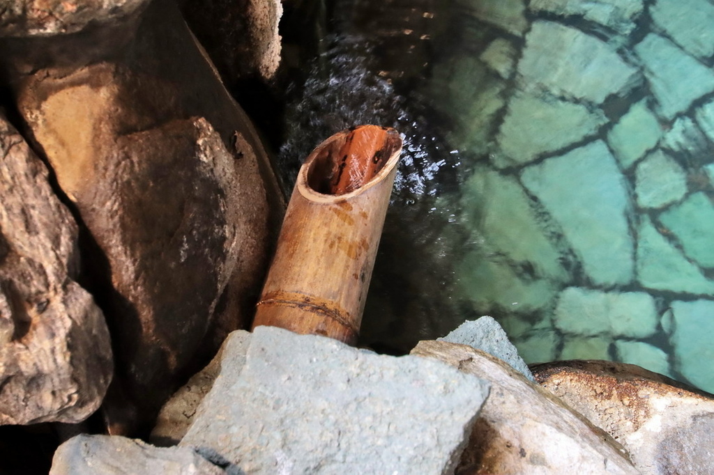 岩井屋唯一的露天風呂,就是這池背戸の湯,它其實只算是半露天溫泉。以大顆溪石等石材打造的湯池,四周掛著竹簾、圍上竹籬笆,湯池比長寿の湯大上一些,這裡標榜跟長寿の湯的泉源一樣,但沒有提供「元湯飲泉」紙杯。