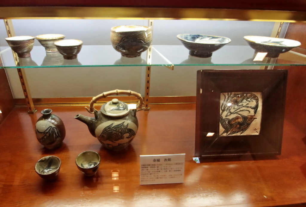 ▲ 大廳一角的玻璃展示櫃,展品有吉田璋也、日本人間國寶金城次郎(1911-2004)的陶燒,也展售了旅店周邊的岩井窯、延興寺窯等知名窯元作品。