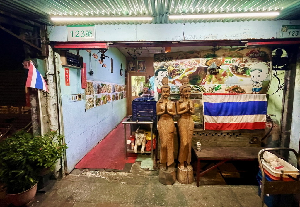 ▲ 老老舊舊的店面掛著泰國國旗、矗立著2座彷彿在說「沙瓦底咖」的木雕。