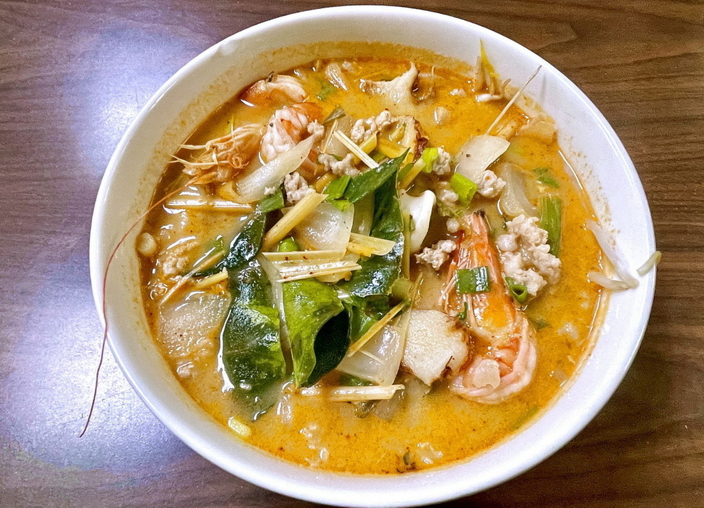 下面這些圖是泰式酸辣河粉湯(140元),它其實就是冬蔭+河粉。這碗河粉湯一上桌,香氣撲鼻、滿滿的泰式風味,喝上一口湯,滿嘴都是南薑、香茅、香菜、新鮮檸檬葉中和出的香氣,椰奶則帶出了冬蔭的純厚度。1碗140元的泰式酸辣河粉湯,配料下的絲毫不手軟,3尾去腸泥的蝦子、肉末、小卷,加上豆芽菜、洋蔥等菜類(可惜沒加我超愛的草菇),整體非常酸香濃厚帶點微辣,超正宗的,無敵好吃。