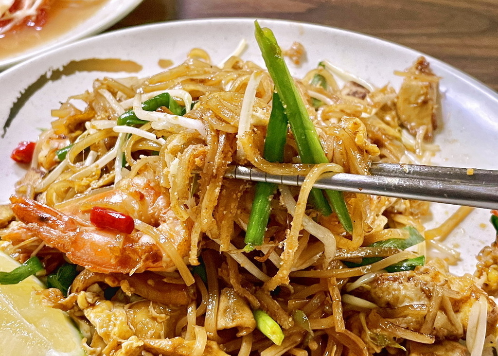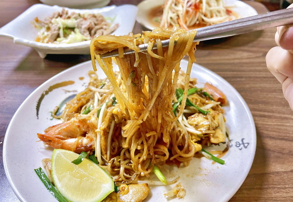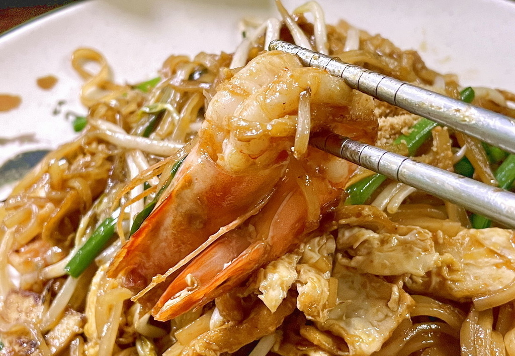 我吃的這盤炒河粉,它的味道基本上就是上述的那樣,但不確定(應該沒有)是否有加泰式蝦膏,配菜則多了3尾去腸泥的蝦子,河粉用的則是與泰式酸辣河粉湯一樣,是帶有Q勁的細扁型河粉,好吃之外,份量也非常多,想念泰國街頭風味的,這道菜一定得試一下。