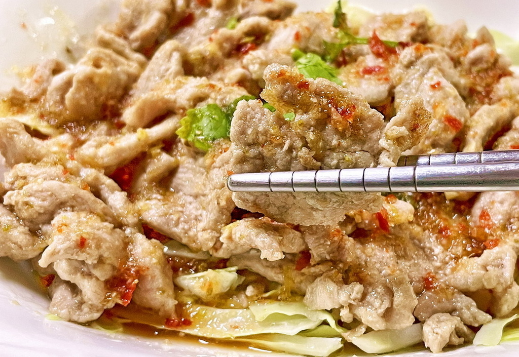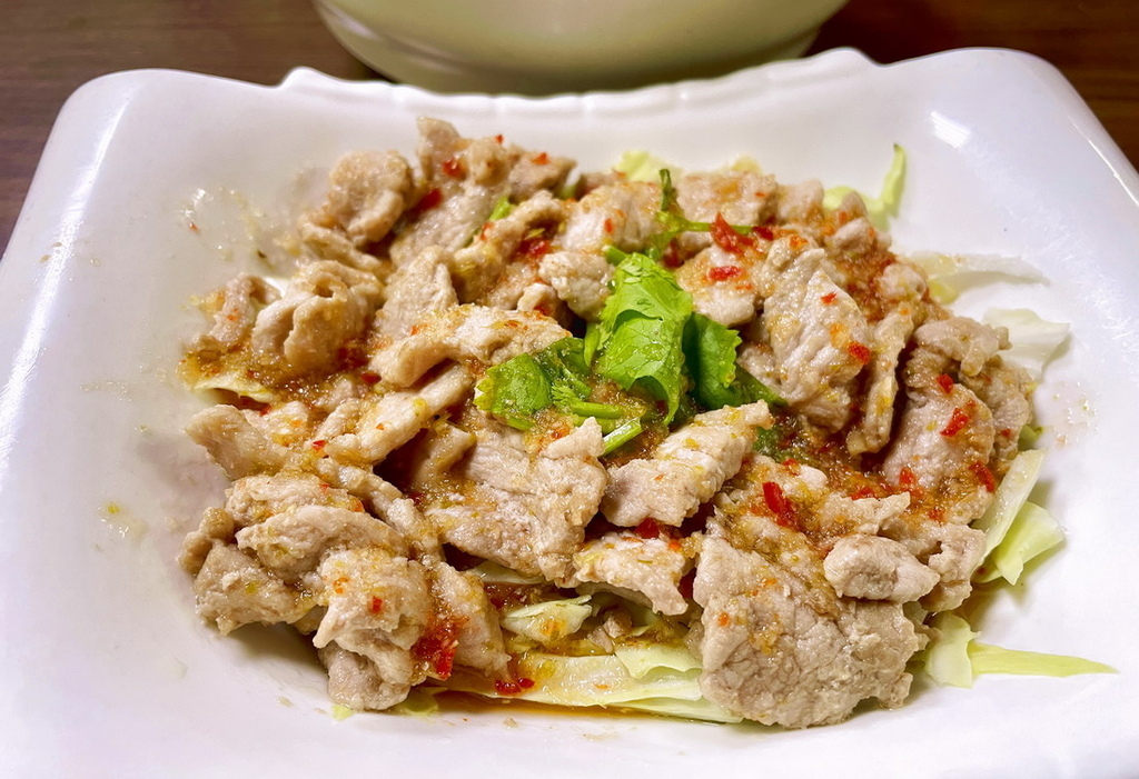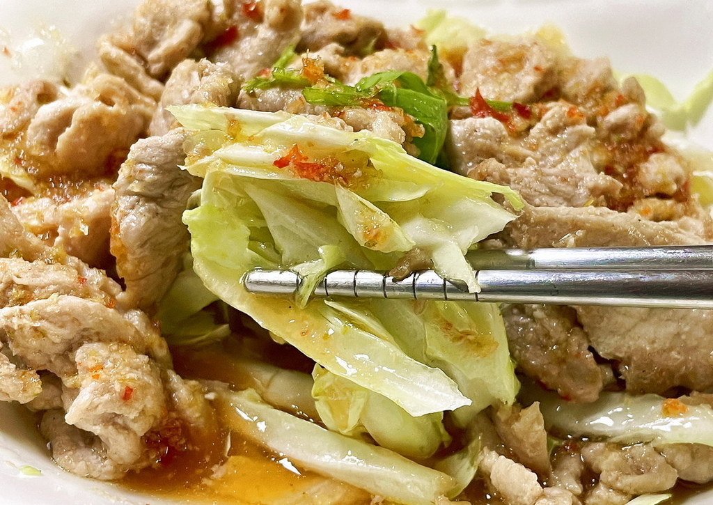 盤子的底層鋪著生的高麗菜、上面則是川燙過的豬里肌肉片,淋上的醬汁中,加入了非常多的蒜泥、檸檬汁,也有著魚露香氣、椰糖風味,很意外的對味。它的醬汁和著生高麗菜一起吃,超級合拍的。