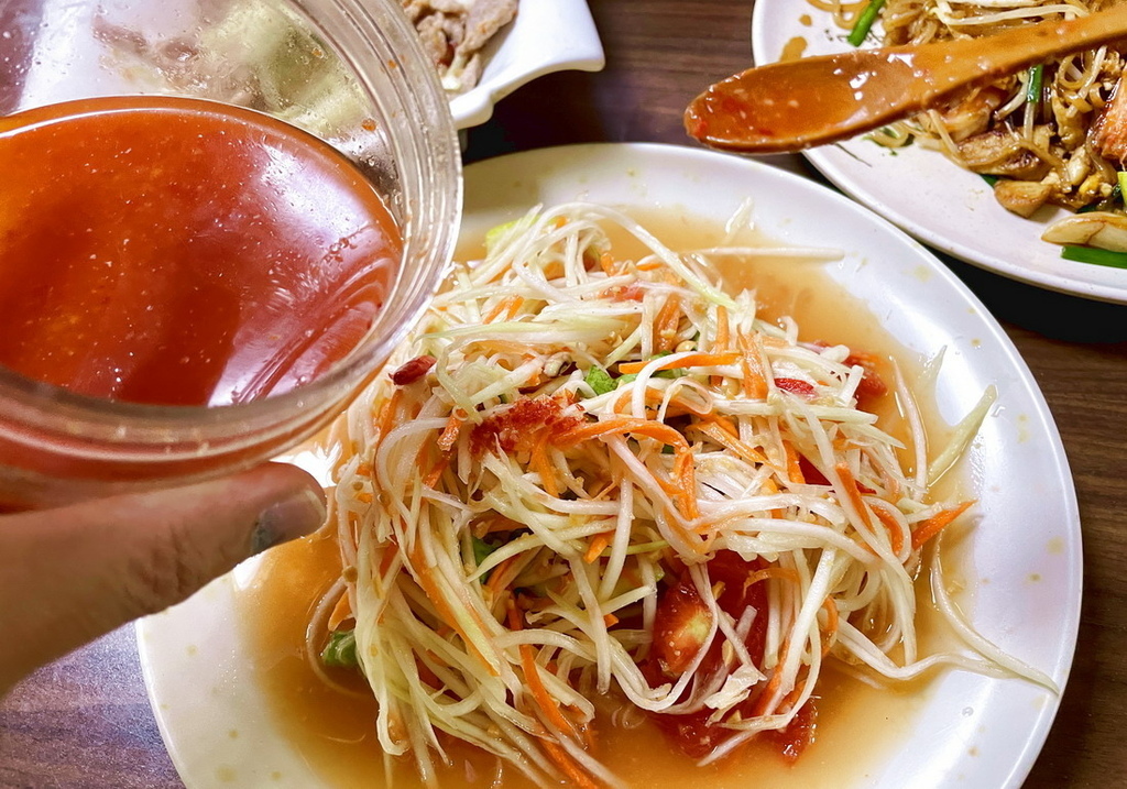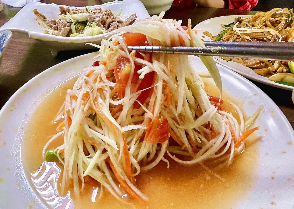 泰式料理中,最讓人熟悉的一道涼拌木瓜絲(100元),這裡給的份量很多,味道是屬於比較清爽的;大把的青木瓜絲,以及紅蘿蔔絲、蕃茄、菜豆,吃起來非常脆口,酸香爽淡,但我覺得味道不夠重,沒加乾蝦米,朝天椒下的也不夠多。在泰國我個人喜歡的口味是東北風味的,也就是重口味的,加上生螃蟹也不為過那種的,不是說這裡的味道不好吃,它就是走基本盤路線的。我又多加了一些桌上的調料才覺得夠味。