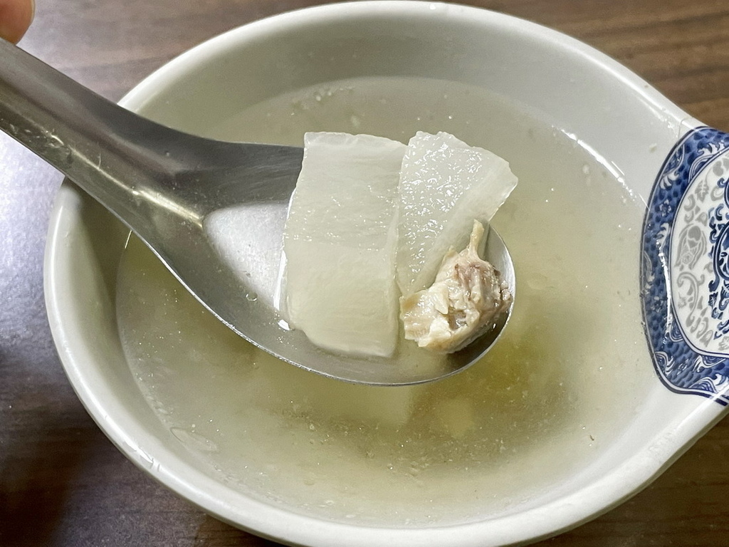 ▲ 這是店家免費提供的湯品,一大鍋放在一角任人取用,這天喝的是蘿蔔湯,很意外的非常台味,鍋裡的白蘿蔔很多。